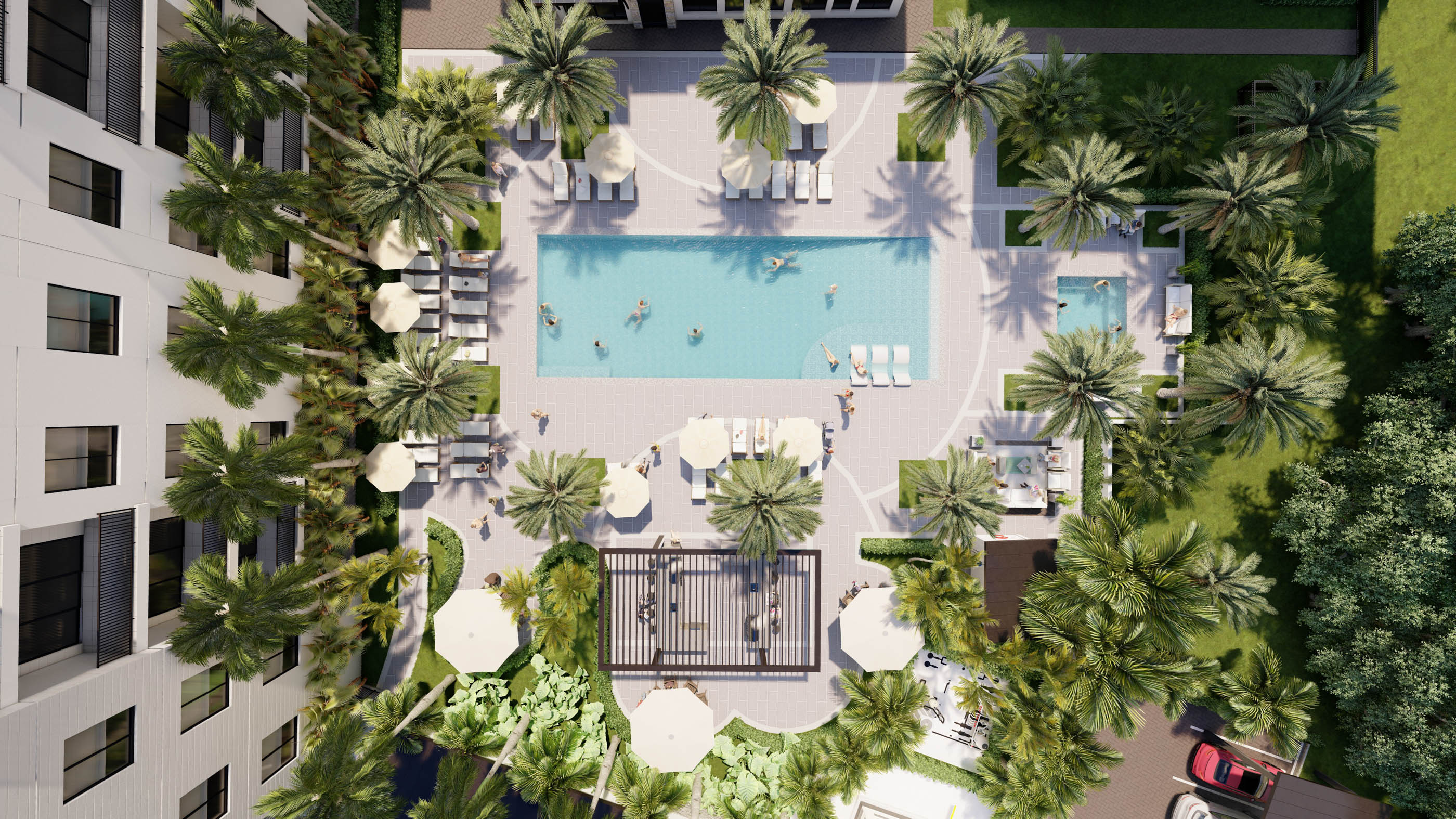 - Pool with cabanas, wellness studio, and clubhouse